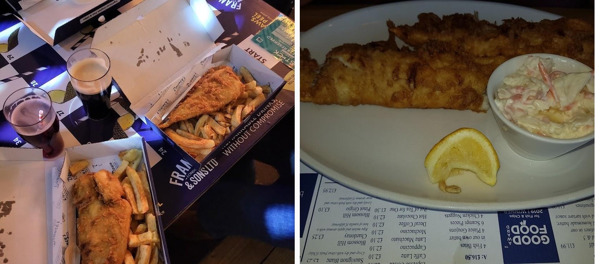A lovely traditional fish and chips shop. I got cod and chips for £10.90. it was cooked to order, piping hot when I came to eat it along with tomato and tartar sauce which were 50p each. Portion size was great and it was delicious. I liked that I could put my own salt and vinegar on as well, nice touch.